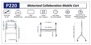Screen Size 75"-90" | Capacity 200lbs (90.9kg) | VESA 200x200 - 900x600 | Upright 9.85" (250 mm) | Input Voltage 100~240V 50/60Hz | Rated Power 75W Max | Operation Control Touch or Wireless |