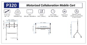 Screen Size 80"-110" | Capacity 200lbs (90.9kg) | VESA 200x200 - 1200x600 | Upright 9.85" (250 mm) | Input Voltage 100~240V 50/60Hz | Rated Power 75W Max | Operation Control Touch or Wireless |